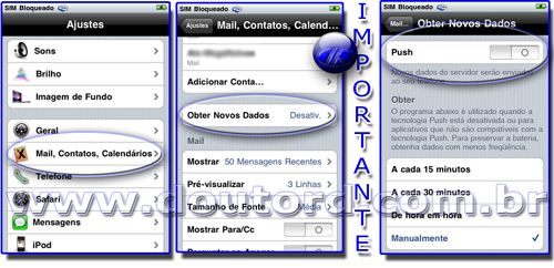 Para desligar o PUSH, vá em Settings, Mail, Obter Novos Dados e você verá a tela do Push, então: DESMARQUE. Por cautela… deixe em "manualmente" também (vide imagem acima)! É que nem sogra quando morre, tem que enterrar e cremar, o que não é pode é facilitar.